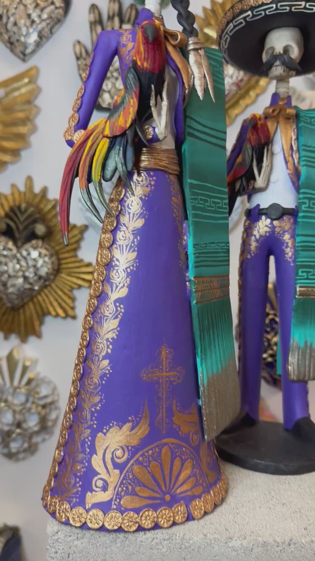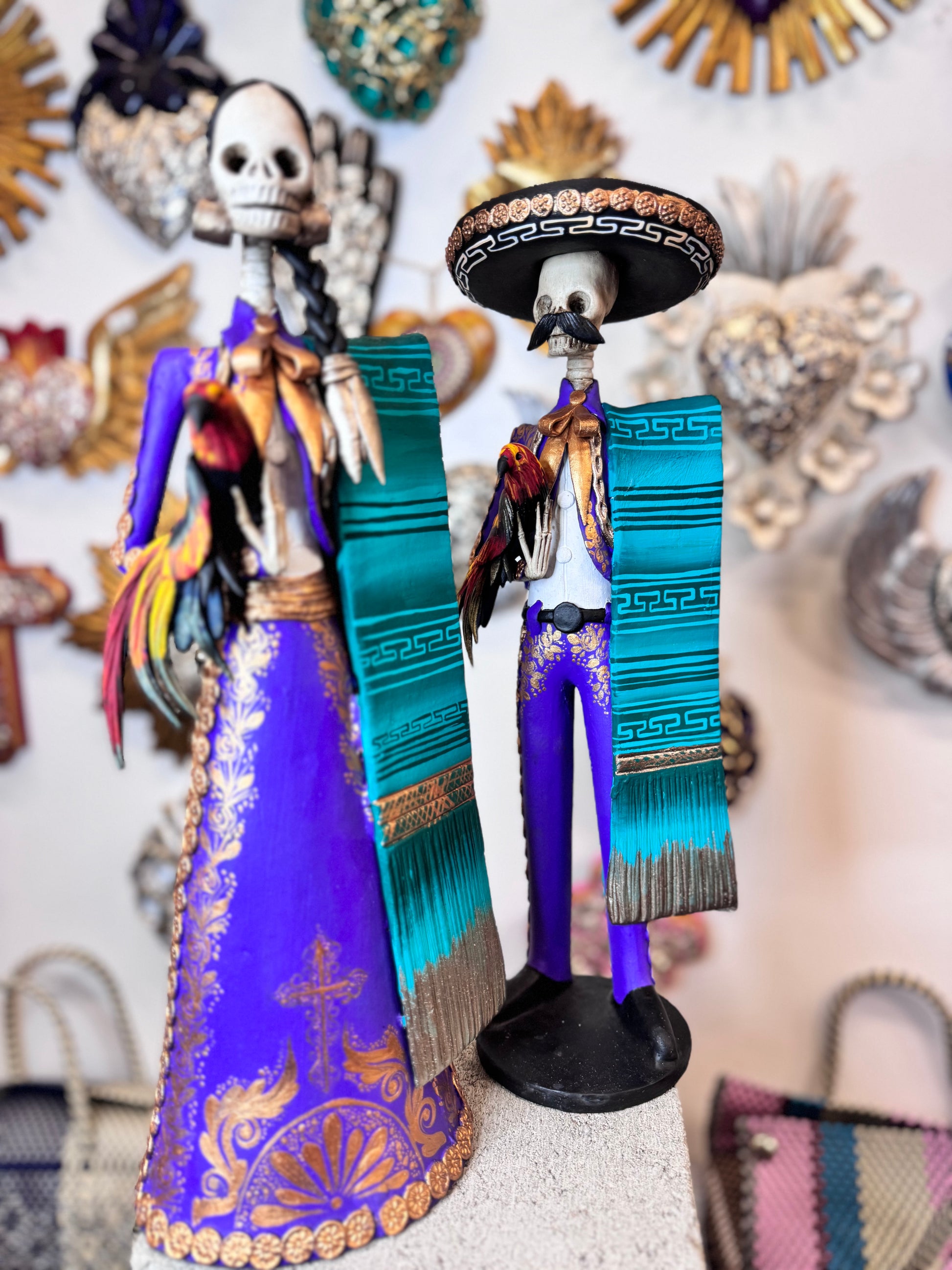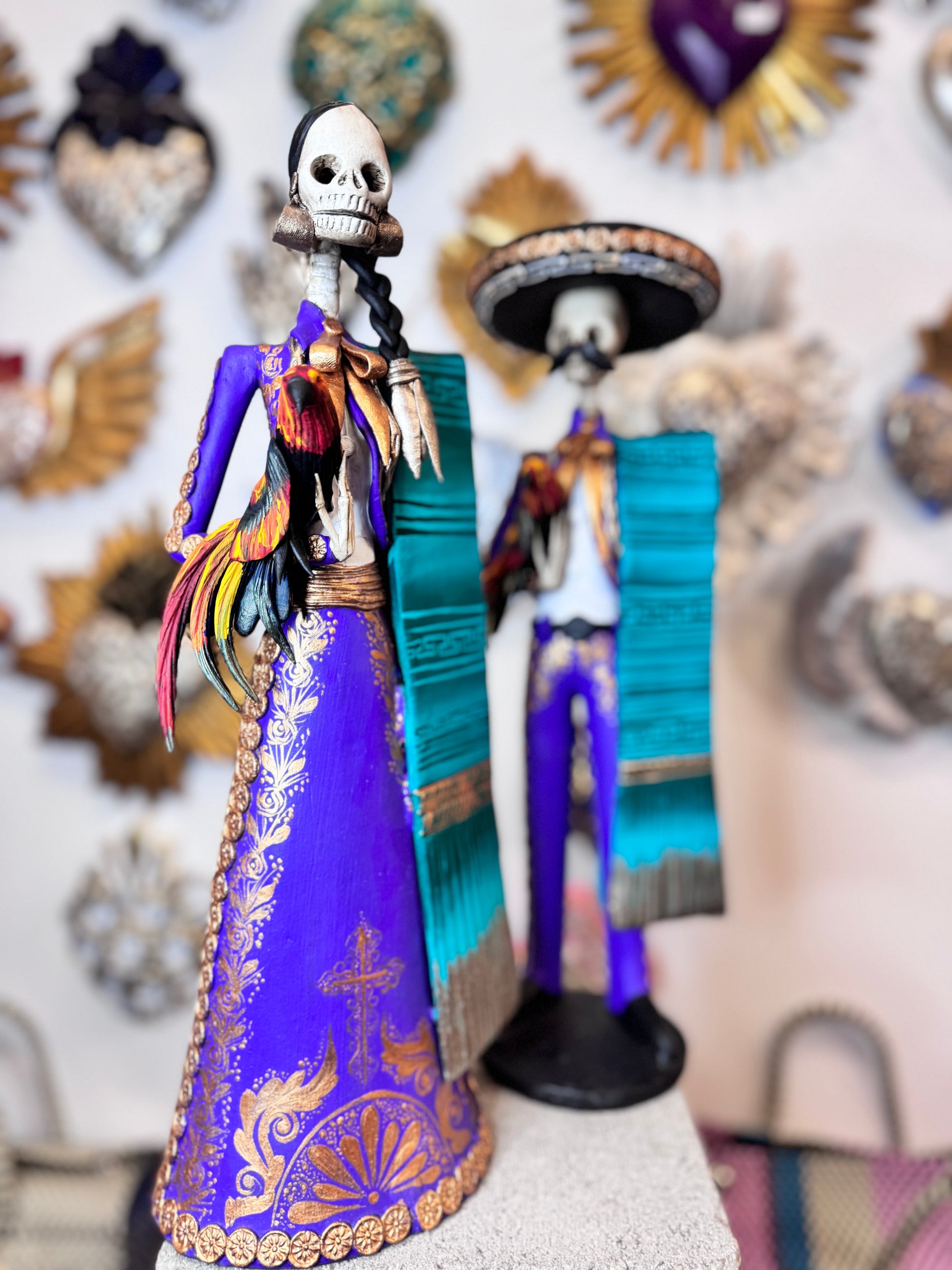 Introducing our Charro Catrinas Set, inspired by traditional Mexican charros. This set features a couple adorned in colorful attire, holding a rooster, capturing the essence of cultural celebration. Expertly crafted, this set is a must-have for any collector or lover of Mexican culture.