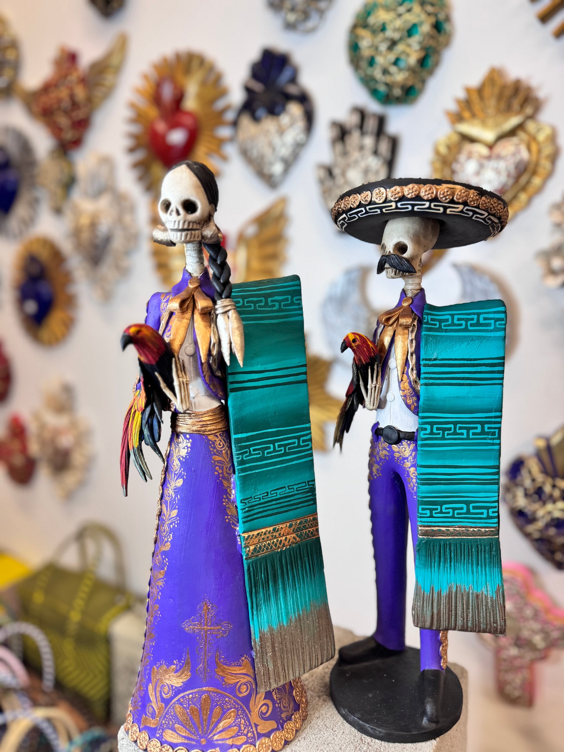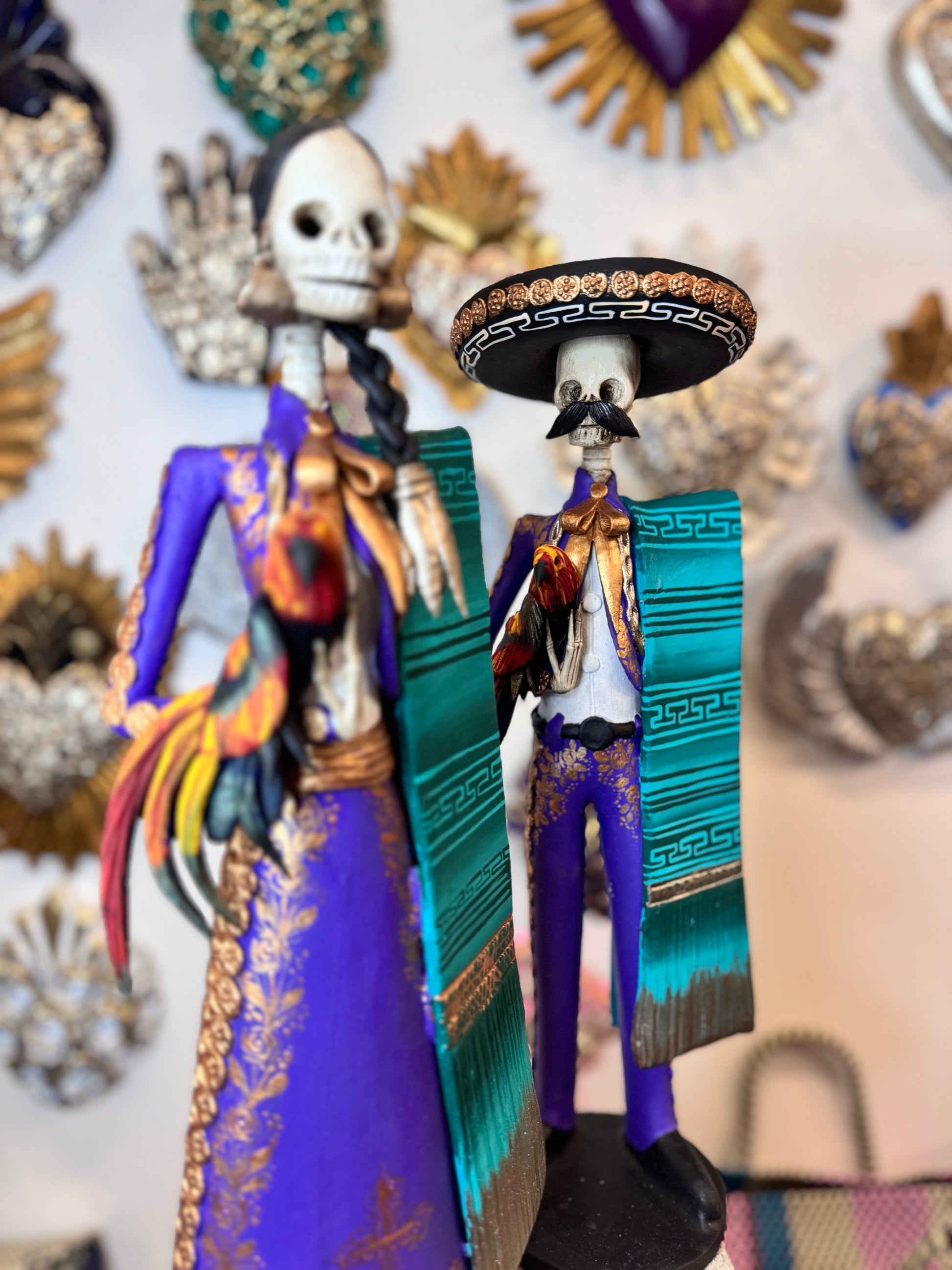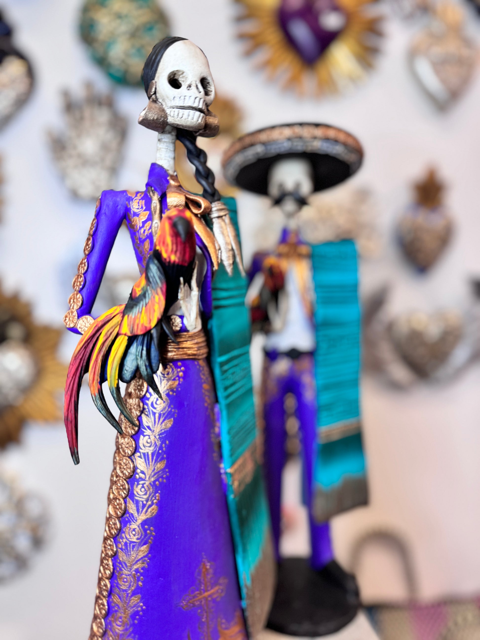 Introducing our Charro Catrinas Set, inspired by traditional Mexican charros. This set features a couple adorned in colorful attire, holding a rooster, capturing the essence of cultural celebration. Expertly crafted, this set is a must-have for any collector or lover of Mexican culture.